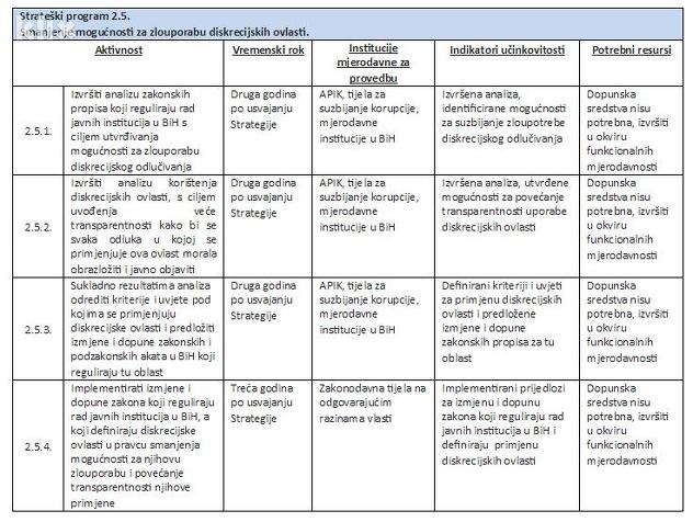 – Implementiranje izmjene i dopune zakona koji reguliraju rad javnih institucija u BiH, a koji definiraju diskrecione ovlasti u pravcu smanjenja mogućnosti za njihovu zloupotrebu i povećanje transparentnosti njihove primjene.