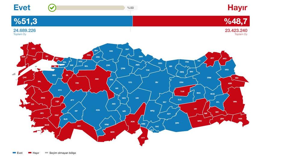 Prema posljednjim informacijama 51,3 posto birača dalo je podršku turskom predsjedniku Recepu Tayyipu Erdoganu za ustavne promjene koje bi mu između ostalog omogućile i ostajanje ne poziciji predsjednika sve do 2029. godine. Na drugoj strani, 48,6 posto glasača bilo je “protiv”.