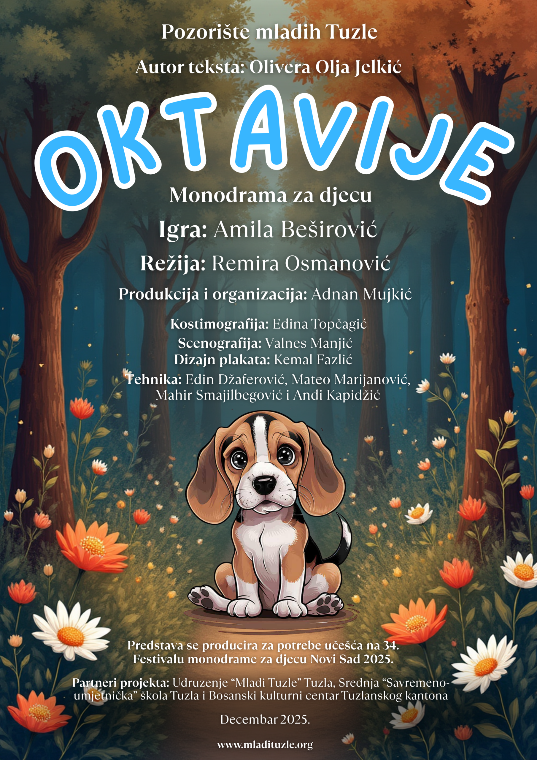 Monodrama „Oktavije“ donosi toplu i nadahnjujuću priču o psu rođenom za slobodu, koji kroz životne izazove otkriva koliko su ljubav, pažnja i razumijevanje važni za sreću svakog bića. Kroz njegovu avanturu najmlađi gledaoci na nježan i poučan način uče šta sloboda znači za pse, kako se oni osjećaju i koliko je snažna njihova odanost kada su voljeni iskreno i odgovorno.