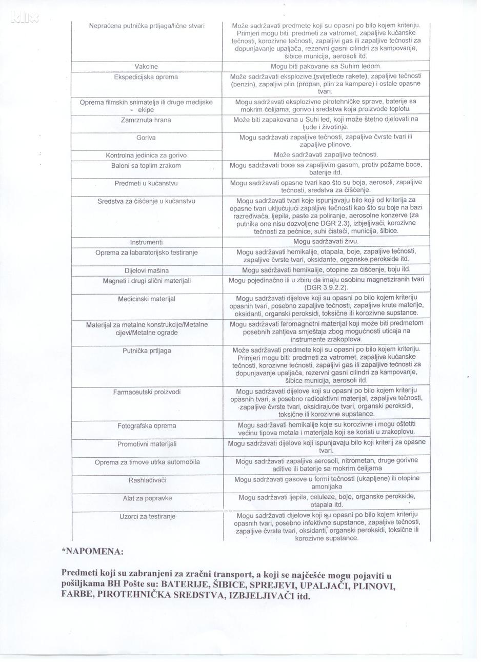 Navode također kako postoji spisak predmeta koji je dostavio Međunarodni aerodrom Sarajevo, a koji, kako ističu, može pomoći korisnicima u pogledu informiranja o tome koje predmete mogu ili ne mogu slati u međunarodnom poštanskom prometu.