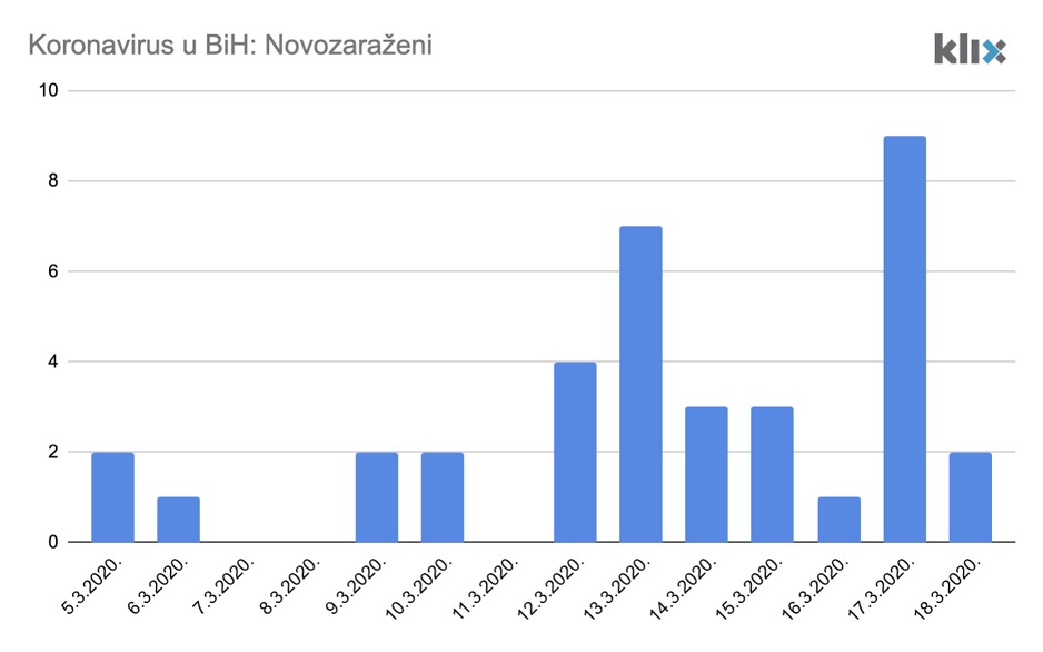 U Bosni i Hercegovini danas su potvrđeno 2 nova slučaja zaraze koronavirusom. Ovim se ukupno broj zaraženih popeo na 36, dok je naknadno iz Mostara došla potvrda o još dva slučaja čime je ukupni broj zapravo 38.