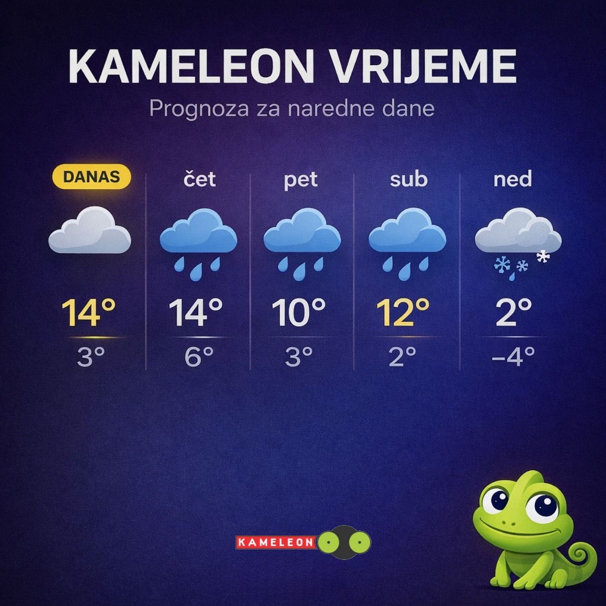 Tokom dana očekuje se nastavak promjenjivog vremena. Kiša će padati u Hercegovini, kao i u zapadnim, sjeverozapadnim i dijelovima centralne Bosne. Na višim planinskim predjelima moguć je i slab snijeg.