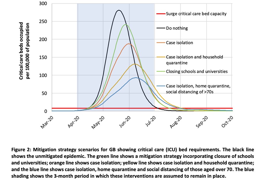 Suprotno tome, izoliranje potvrđenih i sumnjivih slučajeva, kao i socijalno distanciranje starijih i ranjivih osoba smanjilo bi potrebu za medicinskom pomoći za dvije trećine i prepolovilo broj smrtnih slučajeva. Kako bi se broj ljudi koje jedna osoba zarazi smanjio u prosjeku na manje od jedan slučaj, prema mišljenju istraživača potrebna je kombinacija kućne izolacije sumnjivih slučajeva, socijalnog distanciranja čitave populacije, karantina i zatvaranja škola i univerziteta.
